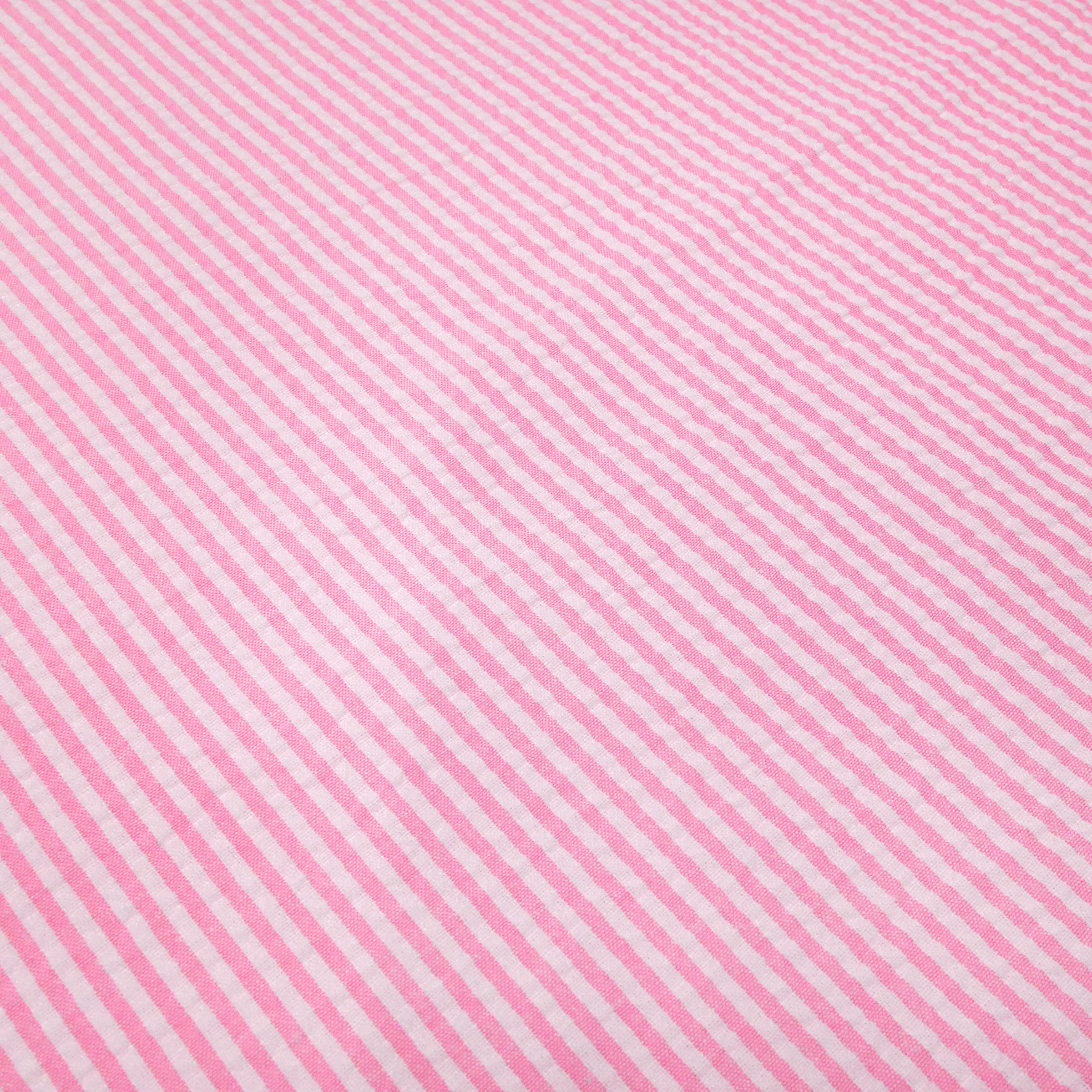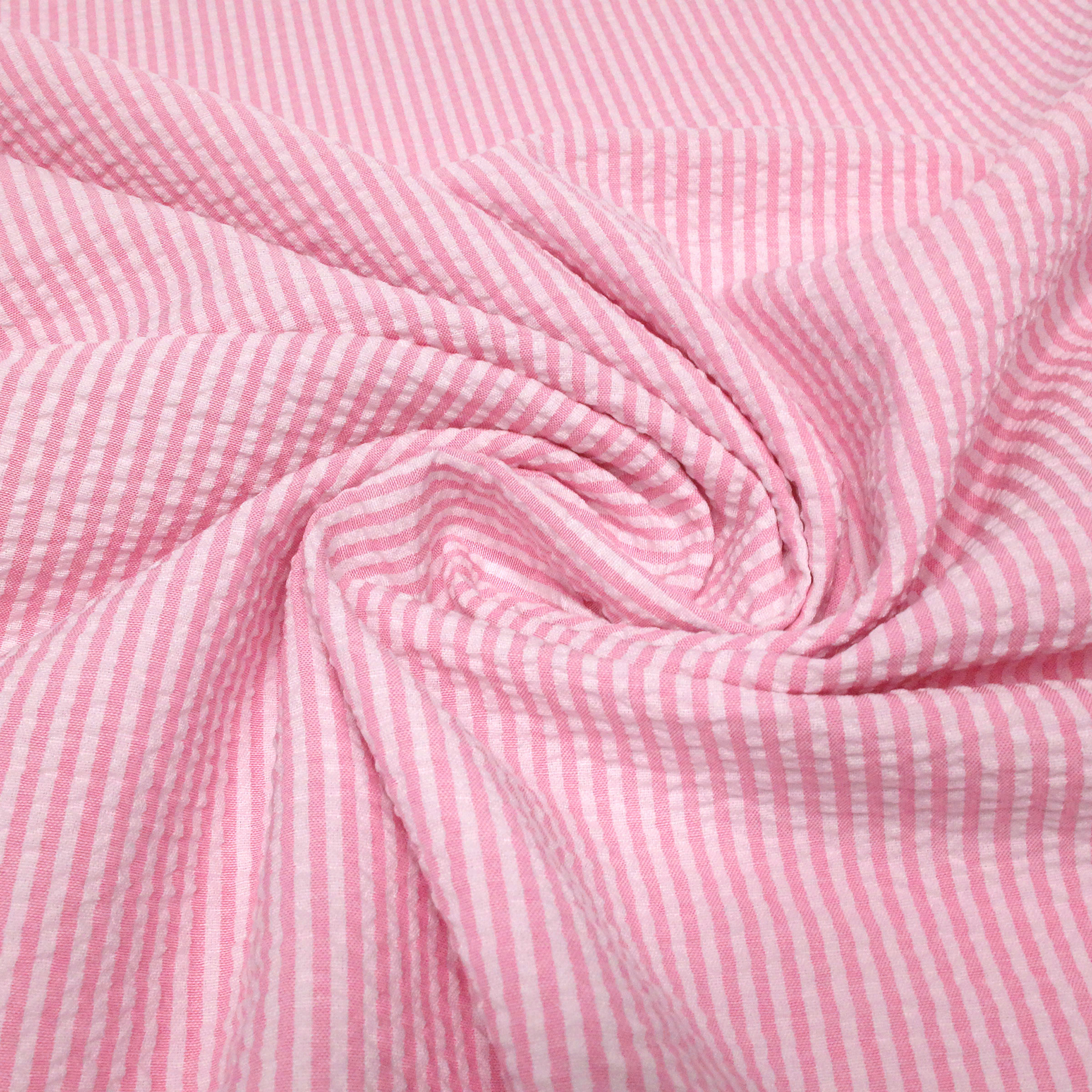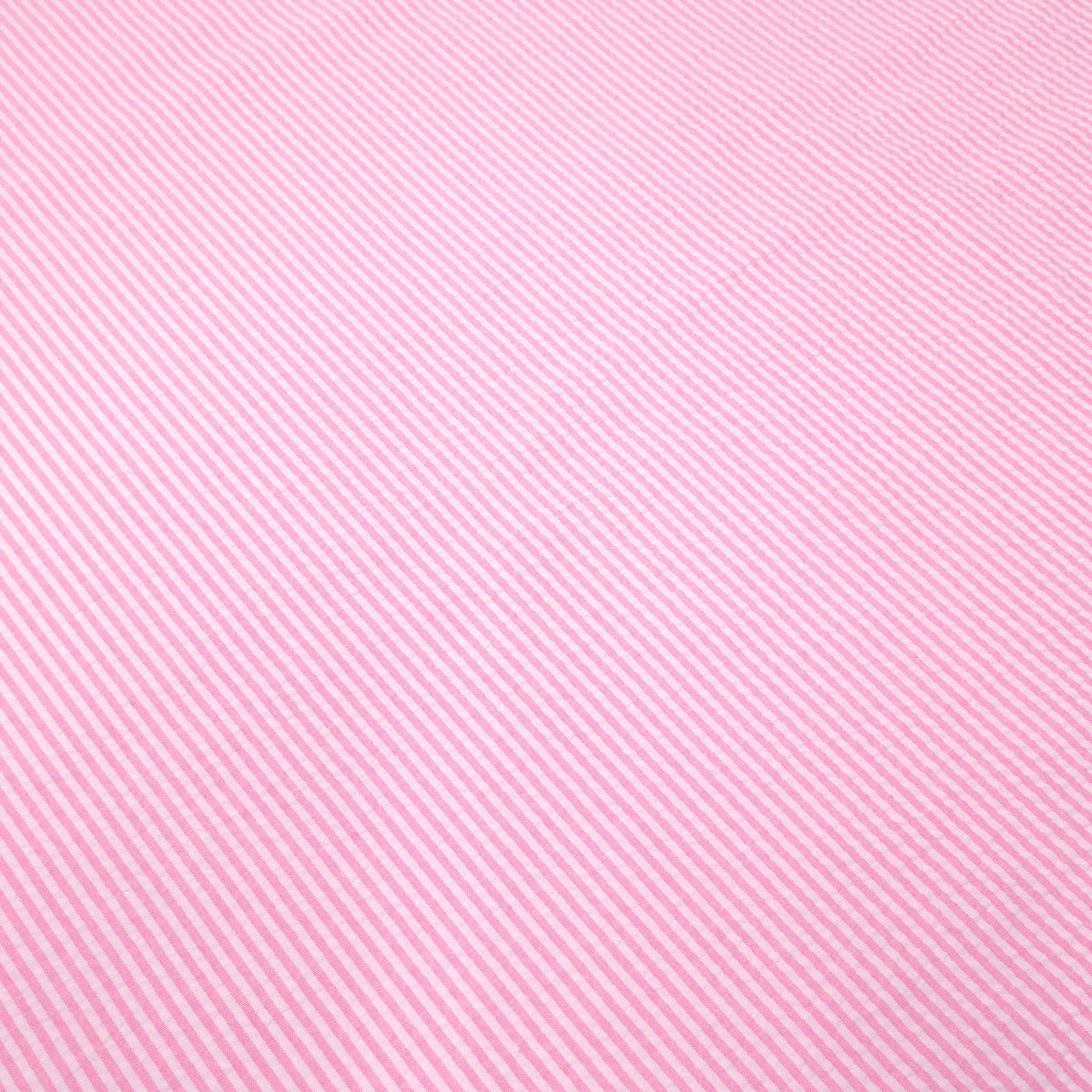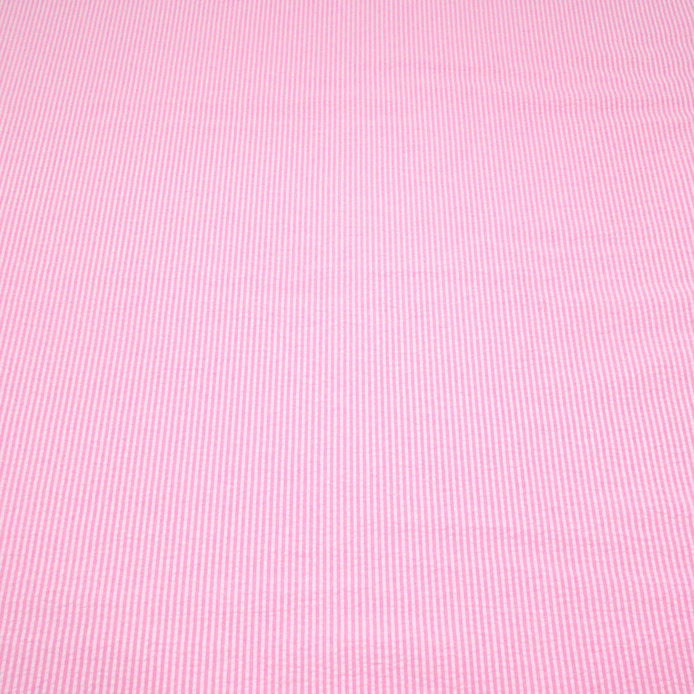 Klassische Seersucker Qualität in einer Baumwolle Polyester Mischung. Der Stoff ist relative leicht (ca. 160 g/lfm.) und ist mit einem ca. 2 mm breiten Streifendesign in rosa und weiß gemustert. Ideal für Blusen, Kleider, Shirt, Röcke oder Accessoires geeignet.