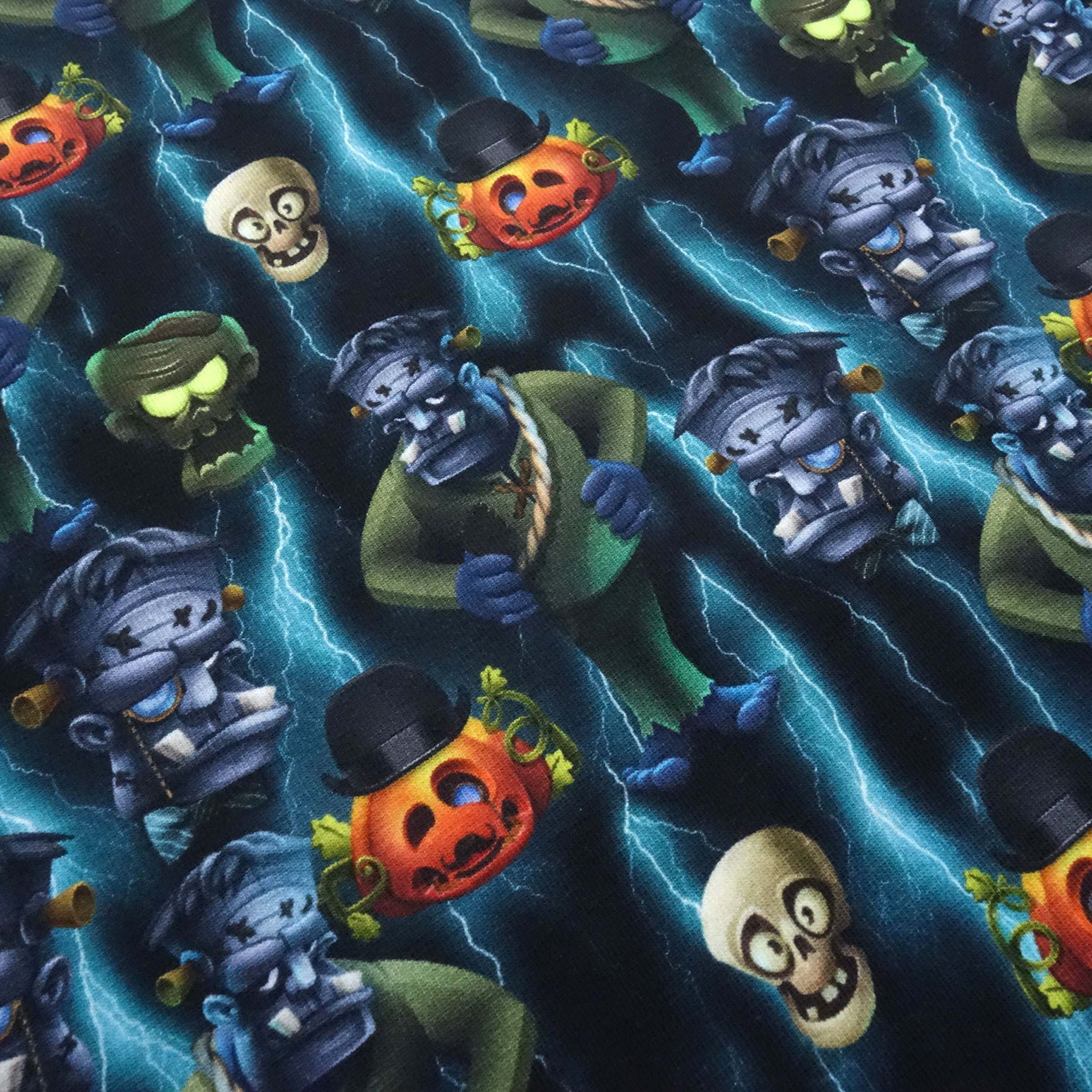 Schöne weiche und fließende Baumwolle/Elasthan-Jersey Qualität. Dieser Stoff ist mit einem tollen Halloween / Zombie / Kürbis / Skulls Design bunt bedruckt. Die großen Zombies haben eine Größe von ca. 5 x 8,5 cm. Ideal für Kinderkleidung wie Shirts, Hosen, Röcke, Kleider oder Accessoires wie Loops, Beanies etc.