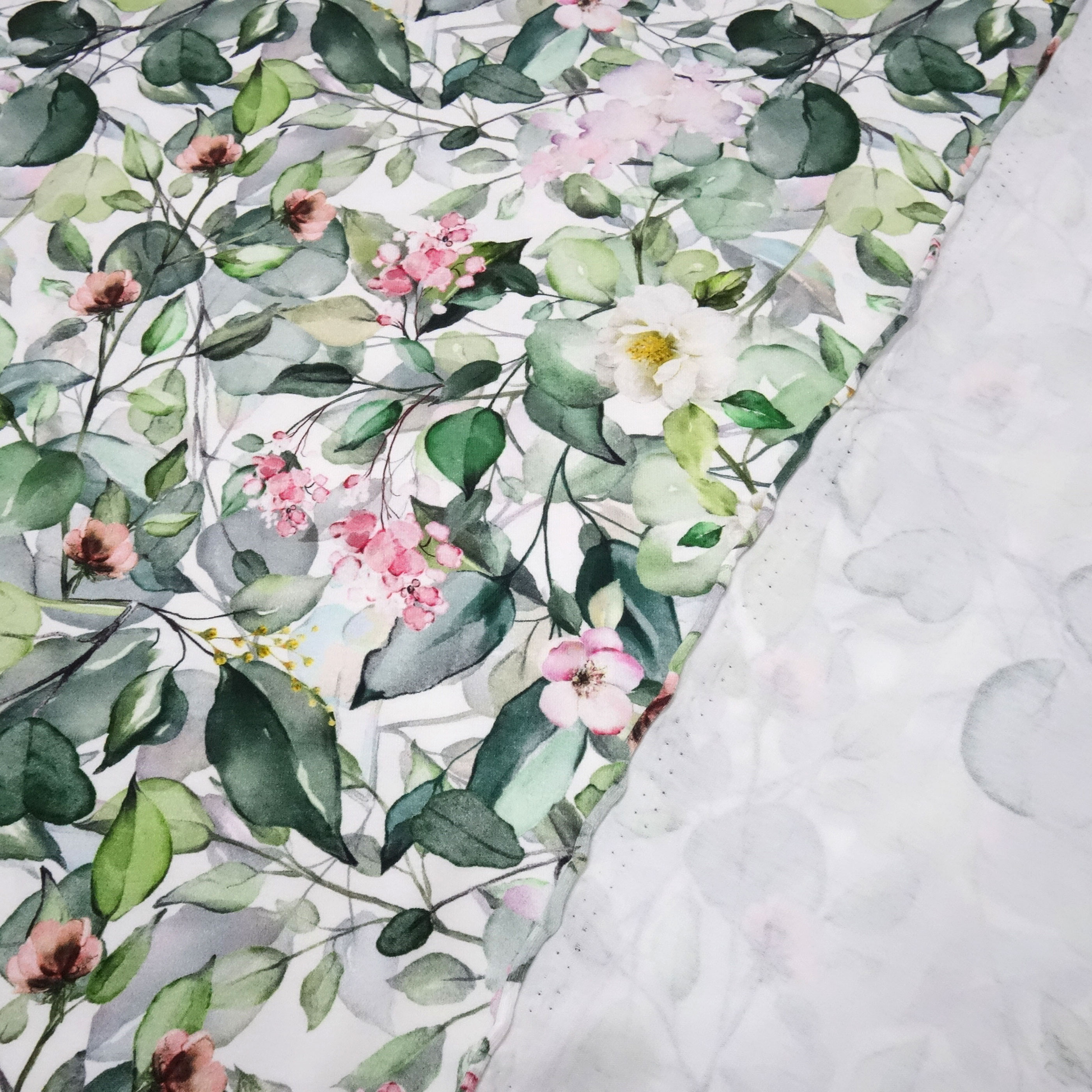 Weiche fließende Baumwolle Jersey Qualität mit einem tollen Eukalyptus / Blumenmuster Design. Die größten Eukalyptusblätter haben eine Größe von 3,5 x 4,2 cm. Ideal für T-Shirts, Shirts, Kleider, Hosen oder Accessoires wie Beanies oder Loops.