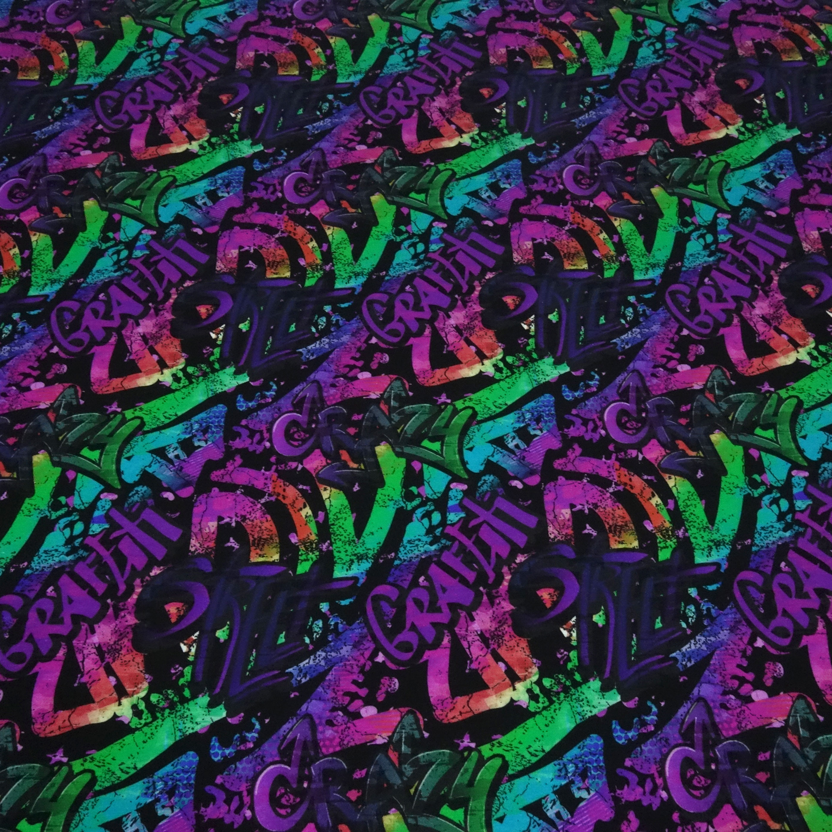 Weicher und fließender Baumwolle Jersey mit Stretchanteil mit einem bunten Graffiti Design. Die einzelnen Graffiti-Worte haben eine Höhe zwischen 4 - 8 cm. Ideal für T-Shirts, Shirts, Kleider, Hosen oder Accessoires wie Beanies oder Loops.