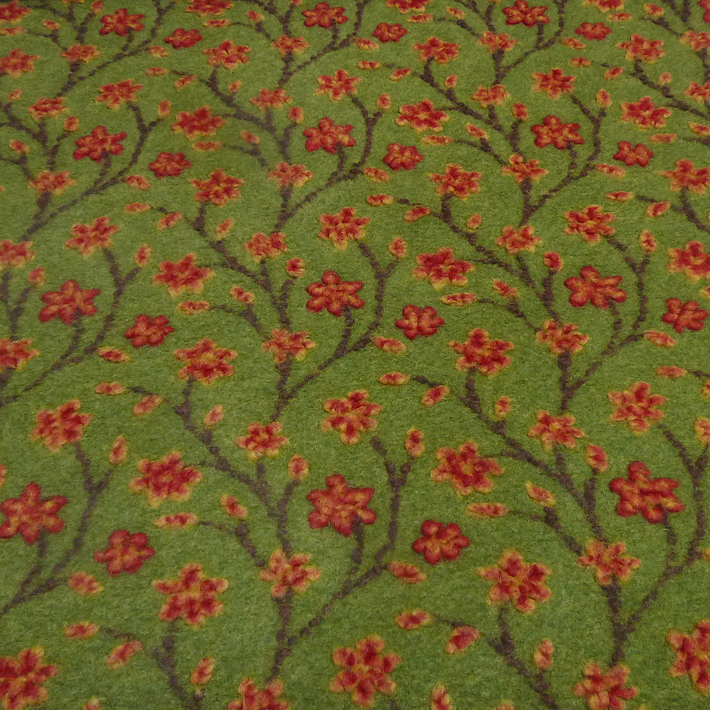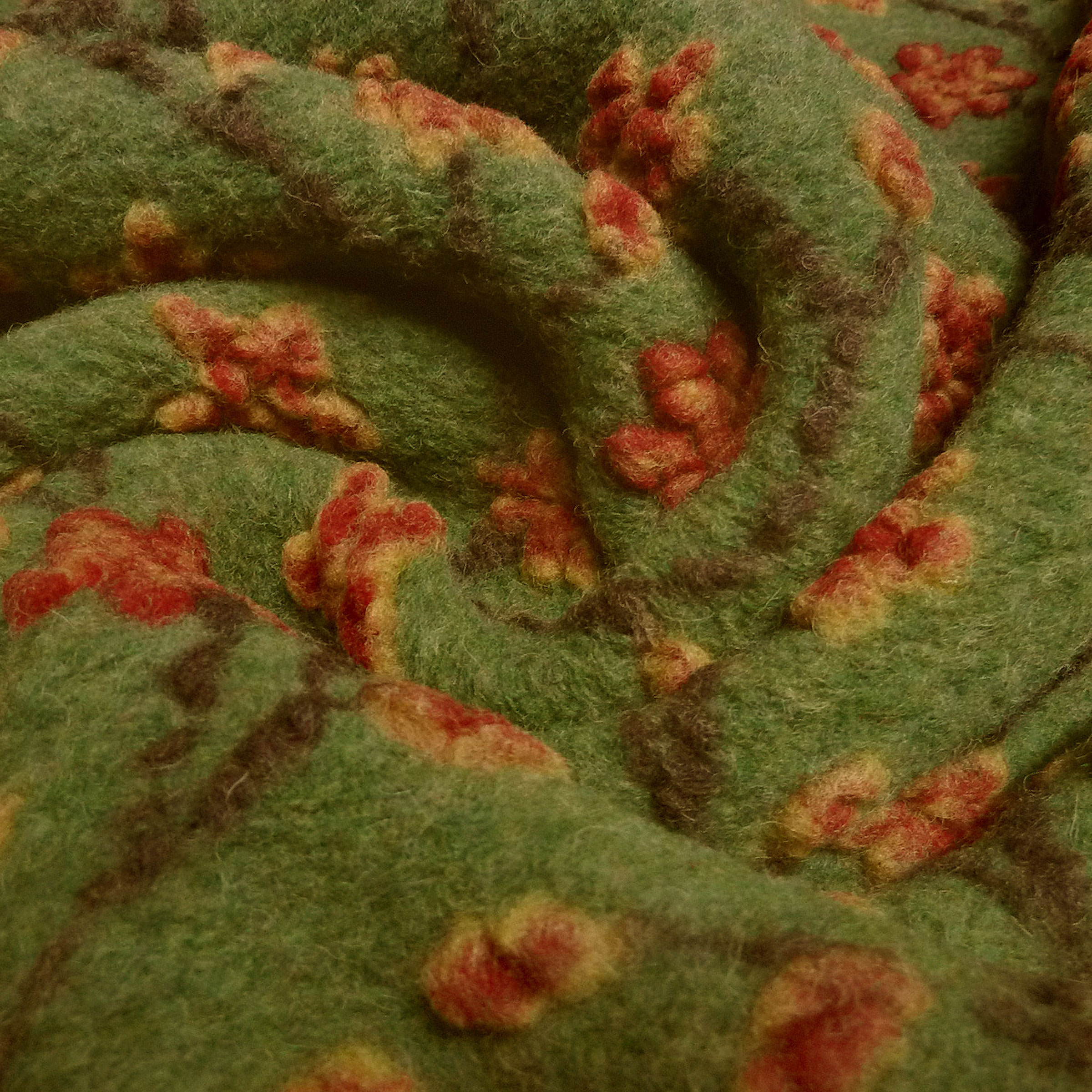 Stoff Ital. Musterwalk Walkloden Kochwolle Relief Blumen Ranken grün gelb rot braun Mantelstoff Kleiderstoff