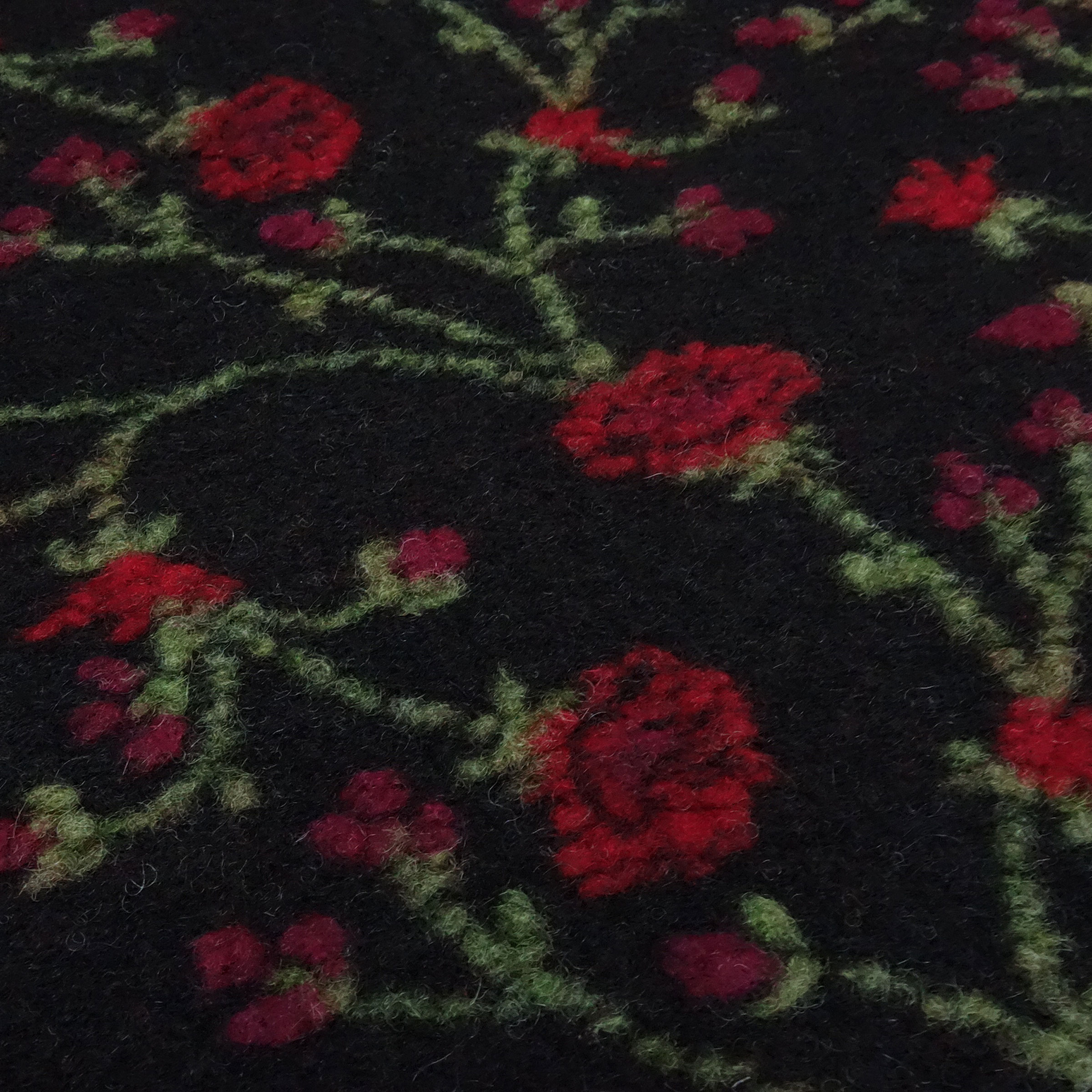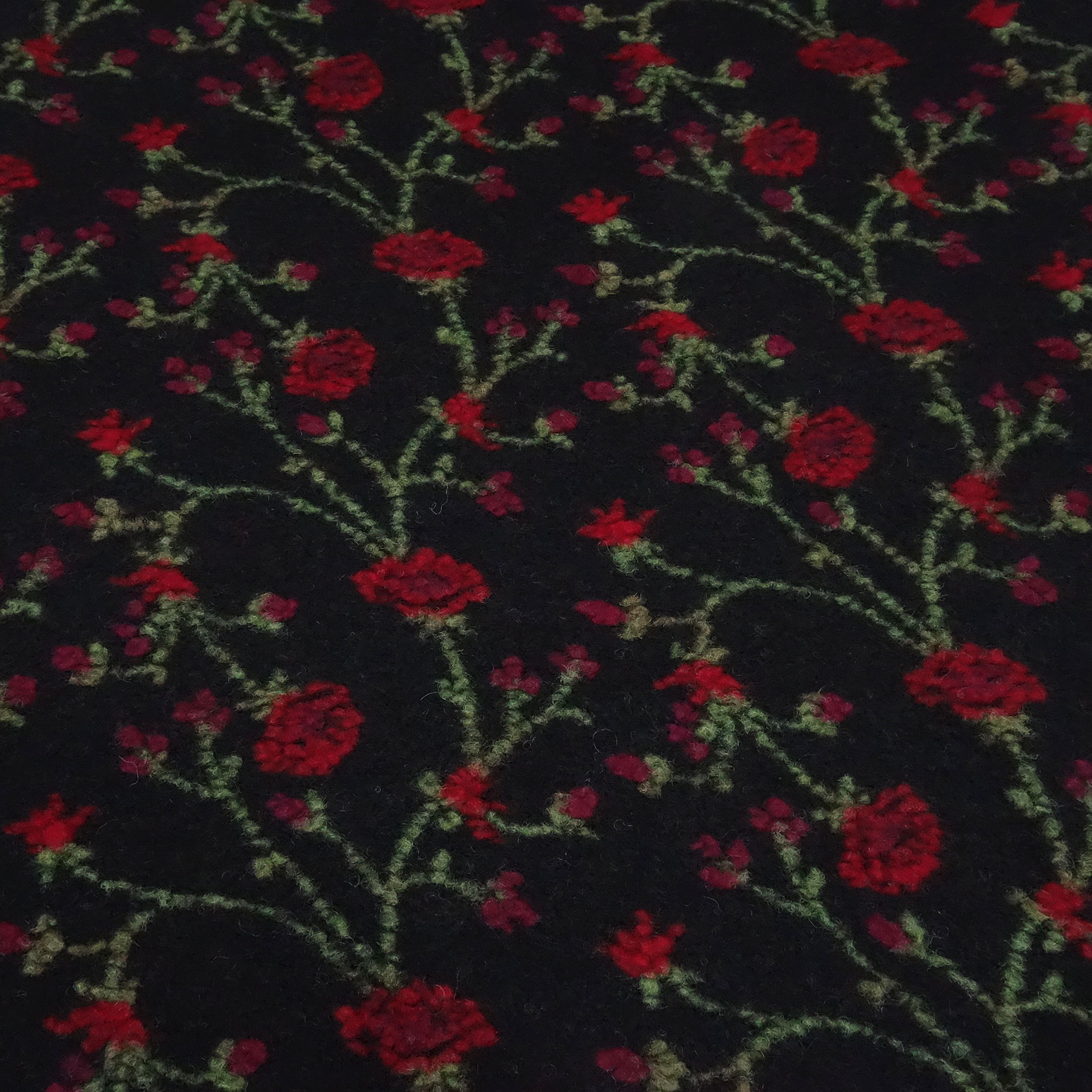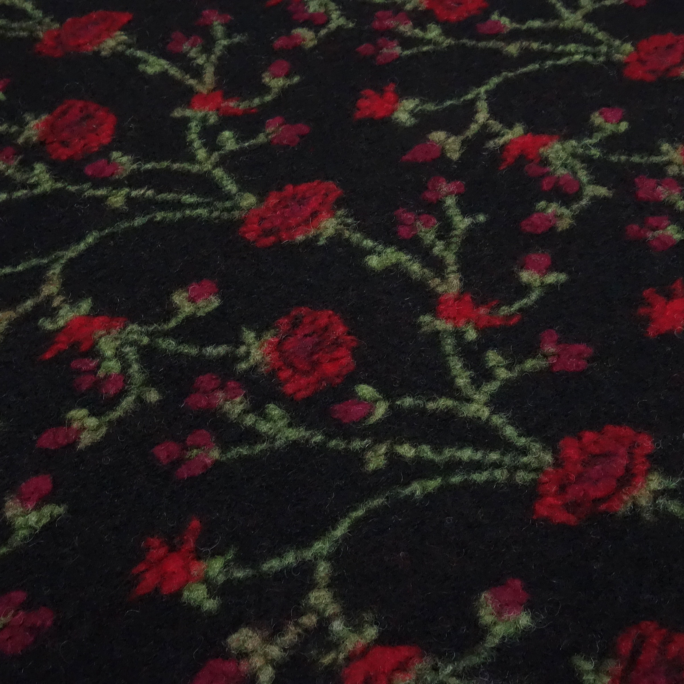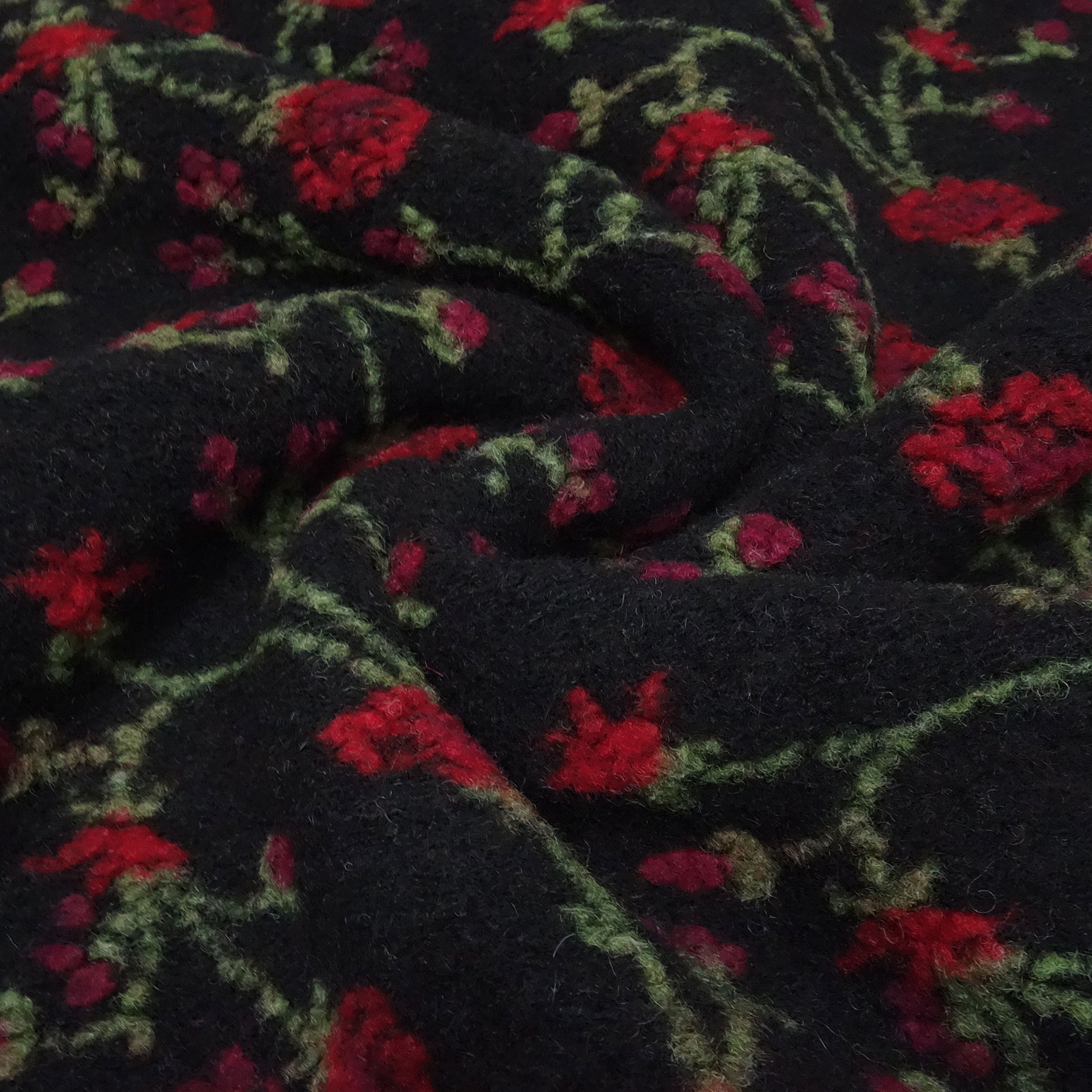 The trend fabric par excellence... A wonderfully soft and flowing boiled wool/boiled loden quality made from 80% wool/20% cotton with a relief motif. The base color of the fabric is black. The relief pattern is a floral vine motif in red and green. The fabric is relatively heavy, weighing approx. 650 g/linear meter. This fabric is ideal for sewing or crafting items such as jackets, coats, cuffs, hats, vests, or other accessories, etc. . But you can also use this fabric as a decorative fabric or for crafting...