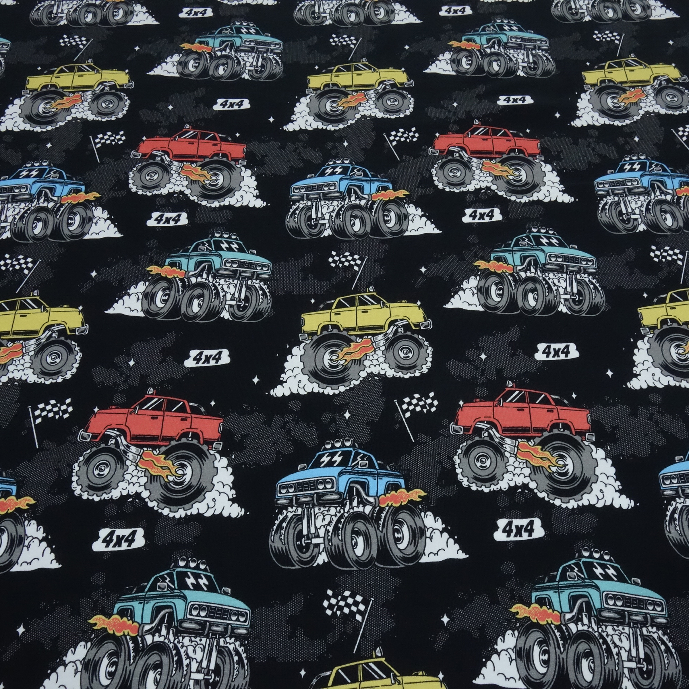 Main page » Fabrics » Jersey » Jersey patterned » Fabric cotton jersey burnout monster trucks cars black colorful children's fabric dress fabric by the meter