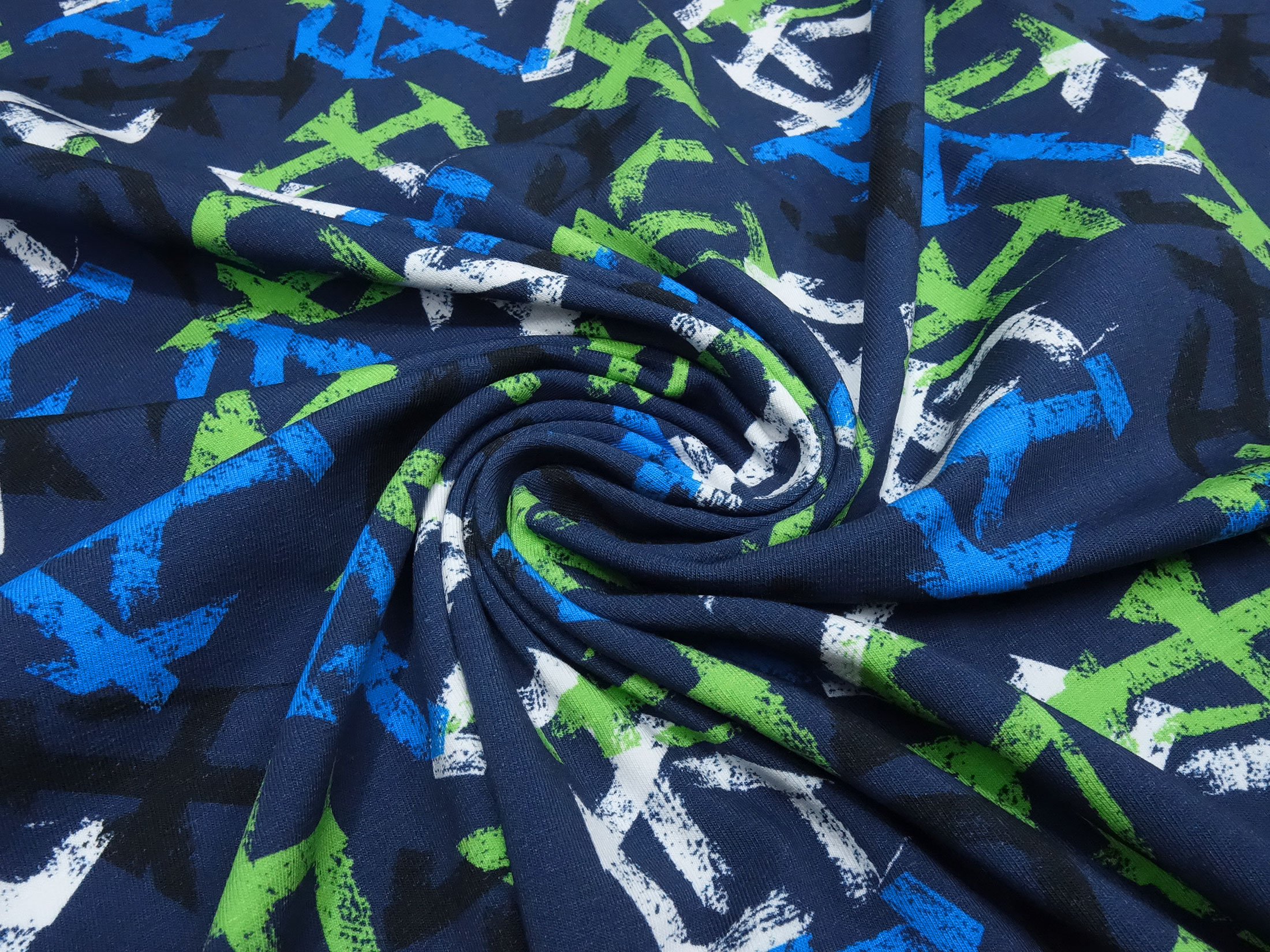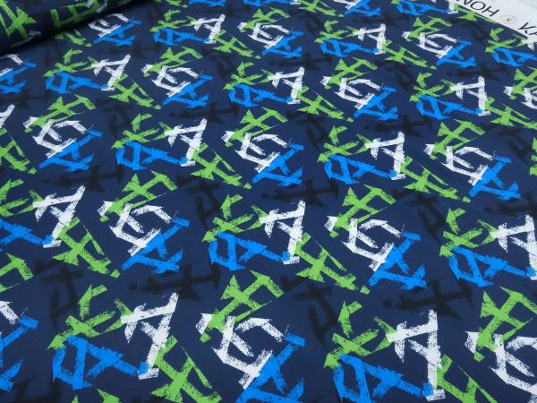 Fabric cotton jersey graphic geometric pattern blue green black white children's fabric dress fabric