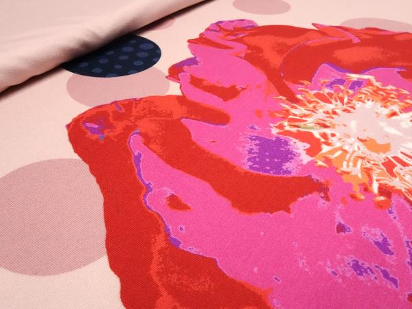Viscose jersey panel with dots/flowers design. The panel consists of two different patterns over the fabric width of 150cm. The left half of the fabric has the dots / flower design (so approx. 91 cm x 74 cm) and the other half of the fabric as a combination fabric is plain (also approx. 91 cm x 74 cm)